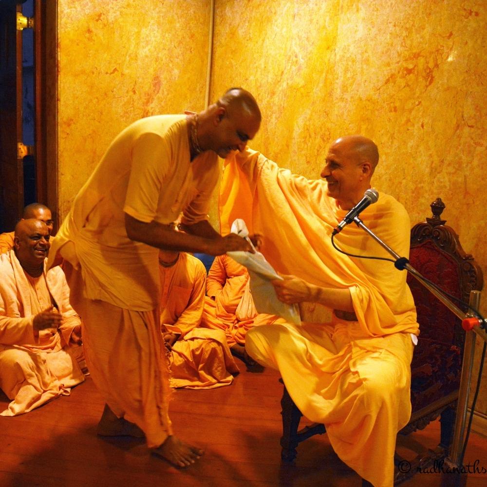 Radhanath Swami reasons that a ship is surrounded by water on all sides, and this water has the potential to sink the ship in minutes. However the challenge for the ship is to remain in the ocean and yet not allow the water to enter the ship. Similarly, Radhanath Swami appeals to all of humanity to face the problems of this world by remaining in the world but not allowing the problems to affect us or drown our consciousness. “This is possible”, says Radhanath Swami, “if we helplessly call out to God through heart felt prayers, begging for the mercy to be able to serve him purely with absolutely no desire for any selfish pursuits.”