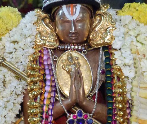Ramanuja and Khuresh hastily left Kashmir. Soon the Pandits discovered their loss, and began chasing Ramanuja and Khuresh. In a day they caught up with both of them and asked Ramanuja acharya to return the book. He humbly gave back the book, and later regretted that he couldn’t avail of the special facility that Goddess Saraswati had herself created for him. Khuresh smilingly reassured Ramanuja acharya that when Ramanuja took rest that night, he had read the entire book. Since he had a super excellent memory, he could recall all the verses of the book. Delighted, Ramanuja and Khuresh penned down the book from memory and returned back to Srirangam. There Ramanuja composed his commentary and established the Visista Advaita doctrine.